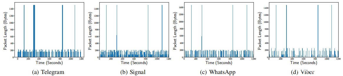 尽管选择Telegram来收集SIM卡流量,但注意到攻击算法在类似WhatsApp和Signal的其他SIM卡上的执行效果相似。这是因为这些服务均未实现流量混淆,因此,不同IM之间的流量形状相似。在下图中对此进行了说明,其中相同的消息流是通过四个不同的SIM服务发送的。可以看出,相同的消息会在不同的IM服务之间产生相似的流量模式。
