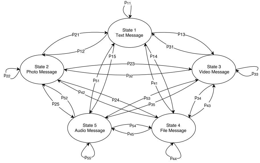 消息大小:上表显示了收集的IM消息中五种主要消息类型的大小统计信息和频率。使用这些经验统计数据来创建如下图所示的五状态马尔可夫链,以对IM通信流中发送的消息的大小进行建模。对于所有频道的聚集以及速率相似的频道组,获得了此马尔可夫模型的经验转移概率矩阵。可以看到具有不同每日消息速率的IM频道的过渡矩阵略有变化。