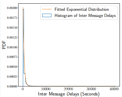 证明了使用MLE算法可以将IMD的概率密度函数紧密地拟合为指数分布。上图显示了200个IM频道的IMD的概率密度函数,每天的消息速率为130条消息。将IMD的指数行为解释为是由于以下事实:消息(或批消息)是在频道中独立发送的(请注意,对于交互式一对一聊天,这将有所不同)。另外认为IMD与消息的类型和大小无关,因为在实践中,消息的发送时间与其类型或大小之间没有关联。