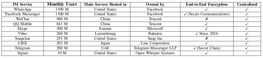虽然攻击也适用于非安全IM应用程序,但攻击者可以使用其他技术来破坏非安全IM服务的隐私。例如,如果即时通讯服务的运营商与监视者全面合作,即时通讯提供商可以让攻击者识别目标用户而无需流量分析机制。同样,无需进行复杂的流量分析攻击就可以轻松窃听具有弱加密的IM服务。下表概述了一些最受欢迎的SIM服务。