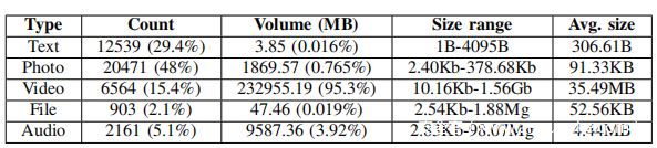 使用Telegram的API来收集1,000个具有不同消息速率的随机信道的通信,每个消息信道持续24小时。对于每个收集的Telegram消息,提取发送过来的频道ID,时间戳,消息类型(文本,图片,视频,音频或文件)以及消息大小。Telegram用户每天可以加入的新频道数量限制为50个。因此会在几天内使用多个电报帐户进行数据收集(还请注意,每个电报帐户都必须与实际的手机号码绑定,以限制一个人可以创建的帐户数量)。