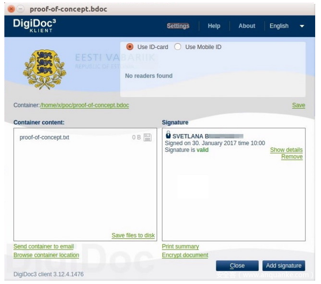 2013年夏天与Toivo取得联系,Toivo告知他的身份证已在Viljandi的PPA客户服务点更新。他提供了加密证明,证明其身份证中的两个私钥均与证书中指定的公钥相对应。为了证明Toivo的身份验证私钥可以成功地用于伪造Ülle的数字签名,在Toivo的协助下创建了以Ülle为名的概念验证数字签名容器(下图)。