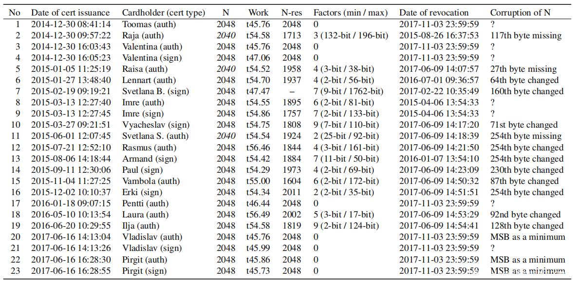 使用软件工具YAFU和椭圆曲线方法(ECM)的GMPECM实现来测试数据集中所有RSA密钥的小因素,已测试到t-level t20。但是,这没有找到任何其他损坏的密钥。其中两个损坏的密钥存在明显异常-模数的长度为2040位。在数据集中发现了另一个异常的2040位模数,并且通过对其进行更多的ECM测试(大约t40),能够找到一个132位的质数因子。后来Nemec等人[2]公开了一种检测易受攻击的英飞凌密钥生成算法生成的模量的方法,能够识别出8种可能损坏的模量。这些是在观察到这些证书(根据证书吊销日期已由于ROCA漏洞而被吊销,因此已针对具有jTOP SLE78功能的ID卡发行的,不具有ROCA密钥结构)而发现的。下表列出了完整的23种已识别证书。