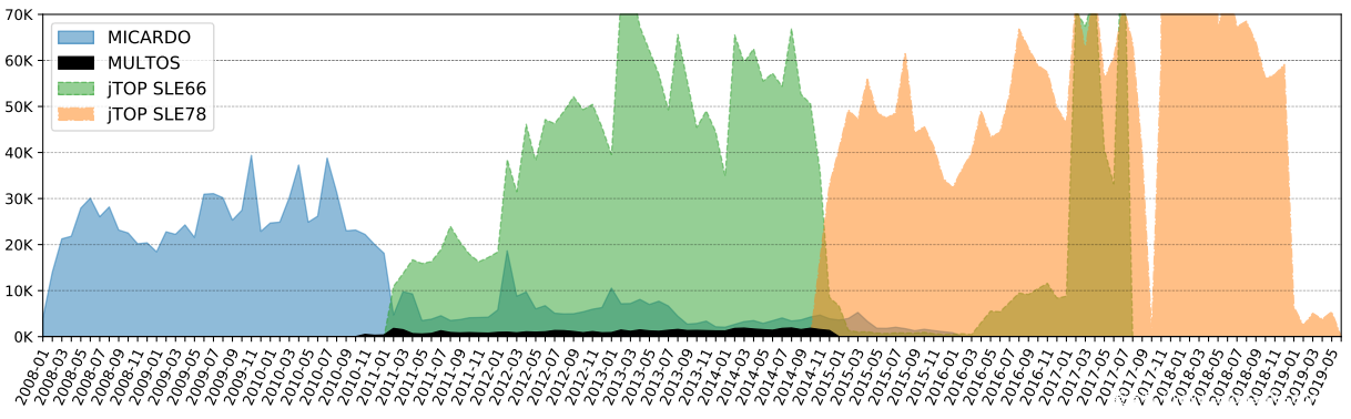 多年来,已经收集了超过700万个在LDAP证书存储库中发布的ID证书。存储库中的证书搜索仅限于个人ID代码。但是,由于所有可能的个人ID代码的搜索空间相对较小,因此,随着时间的推移,所有可能的个人ID代码持有者的证书可能会被搜寻。证书数据集不完整,但认为它包含多年来颁发的ID卡证书的代表性示例。上图显示了ID卡证书在数据集中按发行月(基于证书的notBefore field1)在不同ID平台上的分布。相应的平台已由证书字段和公用密钥的属性确定。由于爬网过程,该数据集缺少2002年至2007年之间颁发的证书以及在短时间内有效的证书。因此,一般而言,发现仅对受影响证书的数量提供了下限。
