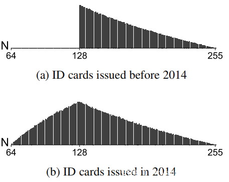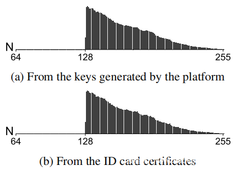 对于2014年发行的ID卡,MSB的分布与平台生成的分布相匹配(上图b)。但是,2014年之前发行的ID卡缺少2047位RSA密钥(MSB值小于128)(上图a)。 3位持卡人除外,他们在2013年10月获得了带有2047位密钥的证书。这些持卡人是SK的两名员工和一名与制造商有关的人员。假设这些卡是在生产之前发行的,用于测试制造过程中的变化。
