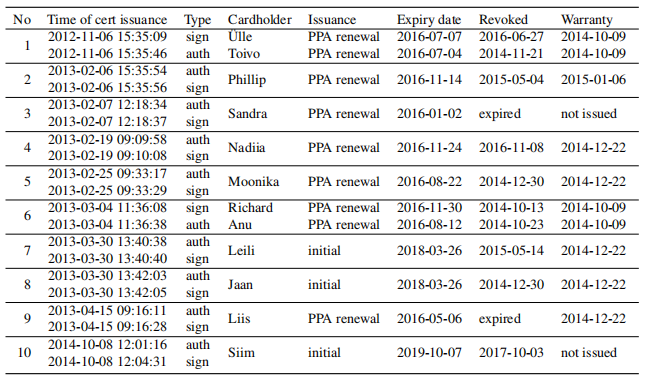 从前表中可以看到,在第3对最初发行的ID卡中还发现了具有重复公钥的证书。这些情况可能是由于单独的个性化错误导致的,其中卡实际上不包含重复的密钥。敦促RIA和PPA使用SK维护的OCSP证书有效性响应数据库进行调查,以查看依赖方是否已请求对所涉及证书的有效性进行确认。由此可以推断ID卡是否已被成功使用,从而包含了证书中指定的密钥,不知道是否已对此进行调查。