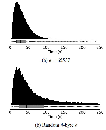 尚不清楚制造商最初是否理解生成具有随机公共指数的密钥会将平均密钥生成时间从33秒增加到87秒(有关分配,请参见上图)。该增加是由于候选日期素数p和q不适合的可能性更大,因为随机选择的公共指数e可能具有较小的素数除数。拒绝2047位RSA密钥会使平均密钥生成时间增加更多,达到141秒。仅生成两个ID卡密钥对,平均就可以将更新过程平均延长大约五分钟,并且在最坏的情况下,甚至可以花更多的时间,如图上图b所示。
