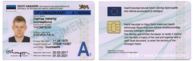 EstEID功能是在SLE78CLX800P芯片上的英飞凌产品SLJ52GCA080CL之上的JavaCard小程序中实现的,该芯片运行由Trusted Logic开发的jTOP JavaCard操作系统。随着切换到jTOP SLE78平台,引入了电子居民的数字身份证。该卡是通过电子居留计划发行给非爱沙尼亚居民的。在2017年初,引入了外交身份证(下图)。该卡发给具有外交地位的人。最初,jTOP SLE78平台使用2048位RSA密钥,但是由于ROCA漏洞,在2017年底,使用曲线P-384切换到ECC密钥。由jTOP SLE78驱动的ID卡已发行至2018年底。当前制造的ID卡由IDEMIA提供的芯片平台供电(本工作未涵盖)。