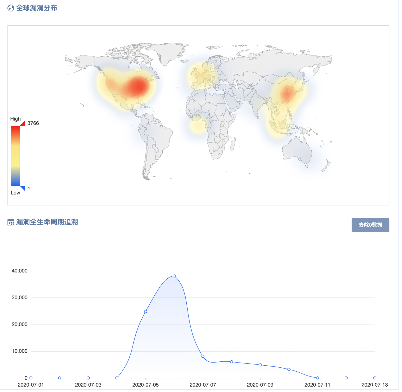 通过对该漏洞活跃情况研判,得到其全球态势和漏洞生命周期: