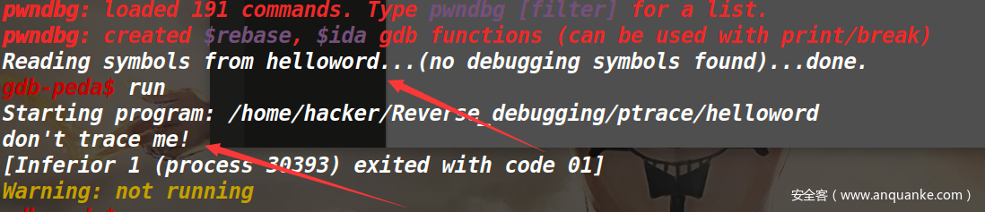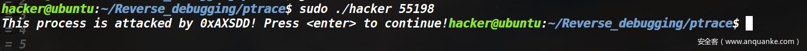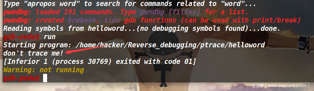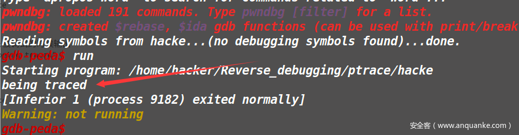 通过函数的返回值是否为-1来判断,是否正在被调试,如果我们直接修改ptrace的返回值,就可以绕过判断,ptrace函数执行之后的返回值将会保存在rax寄存器中,所以我们只需要在ptrace函数那里下断点,然后等ptrace函数结束后,利用set $rax=0指令来设置rax的值,那么就会绕过判断,就能继续调试程序。