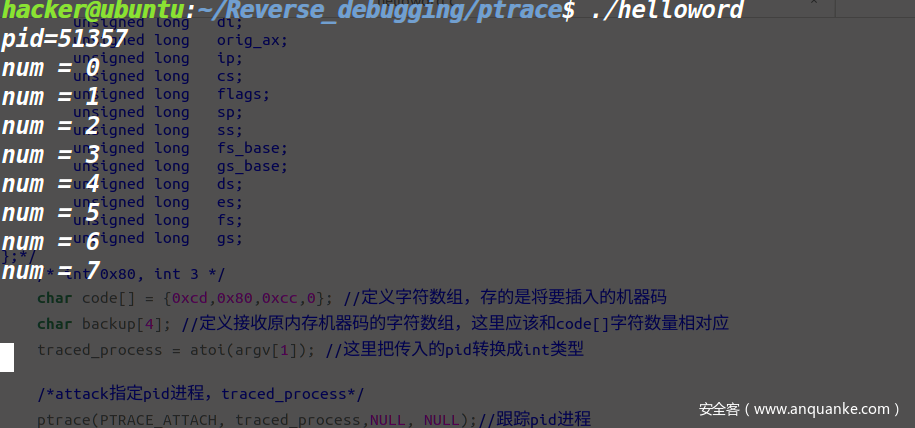 ptrace(PTRACE_SETREGS, traced_process, NULL, ®s);//把修改后的寄存器的值写入被跟踪的进程