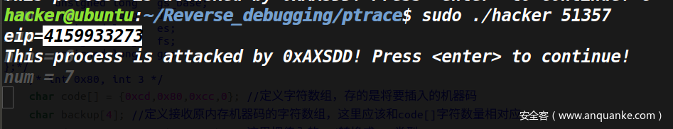 putdata(traced_process, regs.rip, code, 3); /* 将int 0x80, int 3指令的机器码写入rip指向内存地址中,int 0x80长度为2,int3长度为1*/