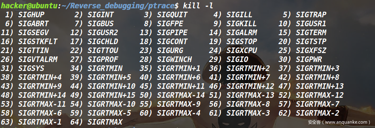 一共62种,其中1~31是非可靠信号,34~64是可靠信号(非可靠信号是早期Unix系统中的信号,后来又添加了可靠信号方便用户自定义信号,这二者之间具体的区别在下文中会提到)