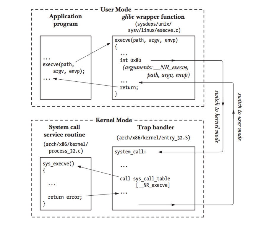 因为我们的栗子会用到execl()系统调用,在此之前我有必要补充一下系统调用这个概念: