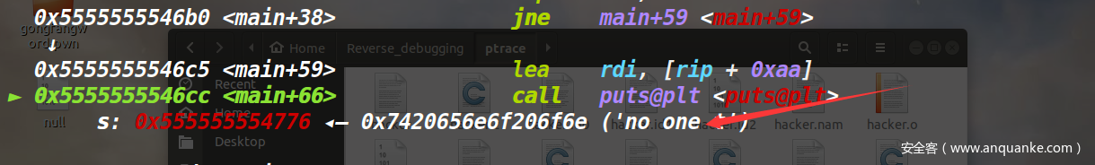 然后c继续执行,第一次暂停是发生在刚开始调用ptrace,然后继续n,n,直到返回到主函数,比较rax的值时候,注意,我们必须得在ptrace执行完成之后,返回到主函数时才更改rax的值