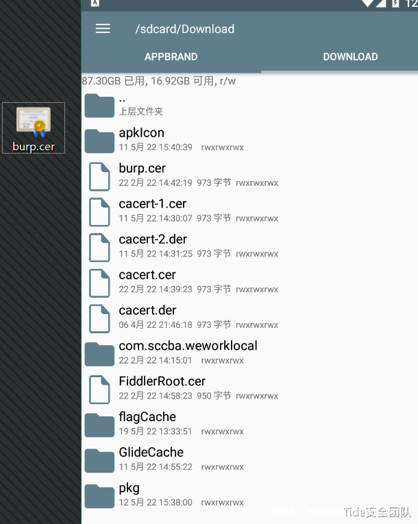 将设备中/sdcard/Download/burp.cer复制到电脑桌面
