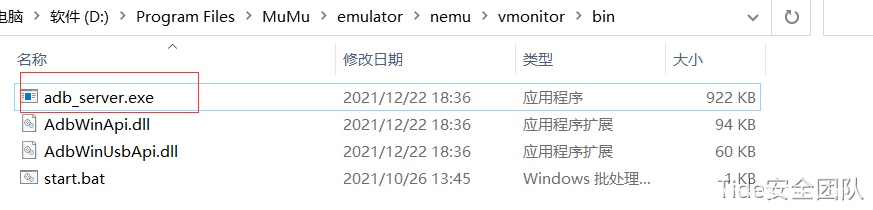 MuMu模拟器系统自带adb在软件安装路径\MuMu\emulator\nemu\vmonitor\bin\下,通过cmd执行adb_server运行