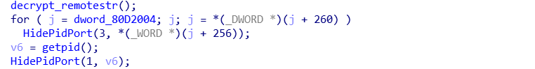 之后,调用rootkit模块功能, 隐藏当前进程所分配的端口号。
