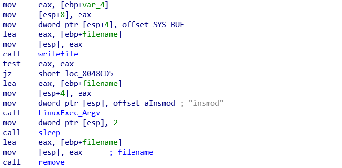 样本自身还携带了一个rootkit模块,能够对文件、端口等进行隐藏,给安全人员的手工排查带来一定的困难。样本运行时会将该模块加载到系统内核,一旦加载完成,就将该模块文件从磁盘删除。
