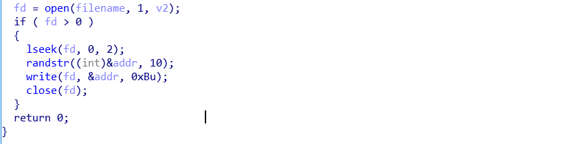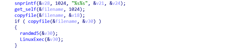 当运行时参数个数不为3时,在之前解密出的系统路径下复制自身,可选路径有/usr/bin, /bin, /tmp, 并通过在样本尾部添加11个随机字符的方式,使自身的hash值每次都不同,用于对抗检查hash值这一类的扫描。