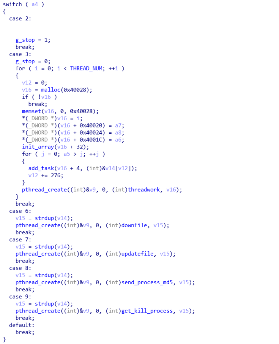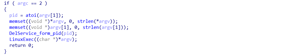 之后通过fork子进程,调用setsid函数,切换到系统根目录等方式,样本创建了一个守护进程。接下来判断运行时参数,如果传入参数个数为2,则删除自身,同时运行传入的第2个参数,猜测此处或为样本更新逻辑。