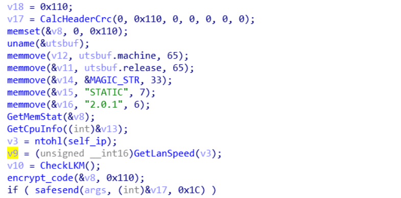 Tcp_thread线程首先向c&c服务器发送肉鸡的硬件及软件信息,包括设备类型、设备版本、一段32个字节的随机字符串组成的设备id、固定的字符串”STATIC”、当前bot的版本号2.0.1、 内存使用情况、cpu频率、当前网速,以及当前设备上的rootkit的安装情况等信息,这些信息在加密后被发送到服务器端。