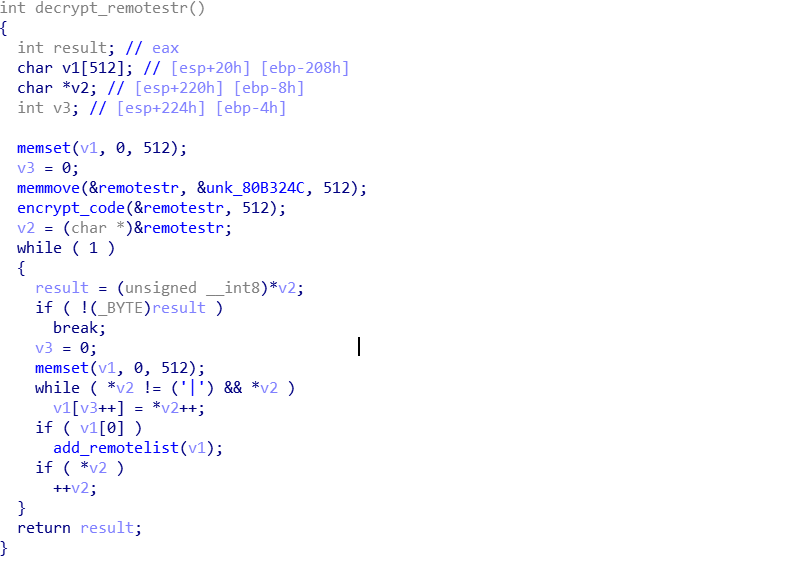 接下来样本会解密出远程服务器地址,之间用|符号进行分隔。其中unk_80B324C处解出的地址列表为: soft8.gd***.com:3802|113.10.*.*:3802|baidu.gd***.com:3802