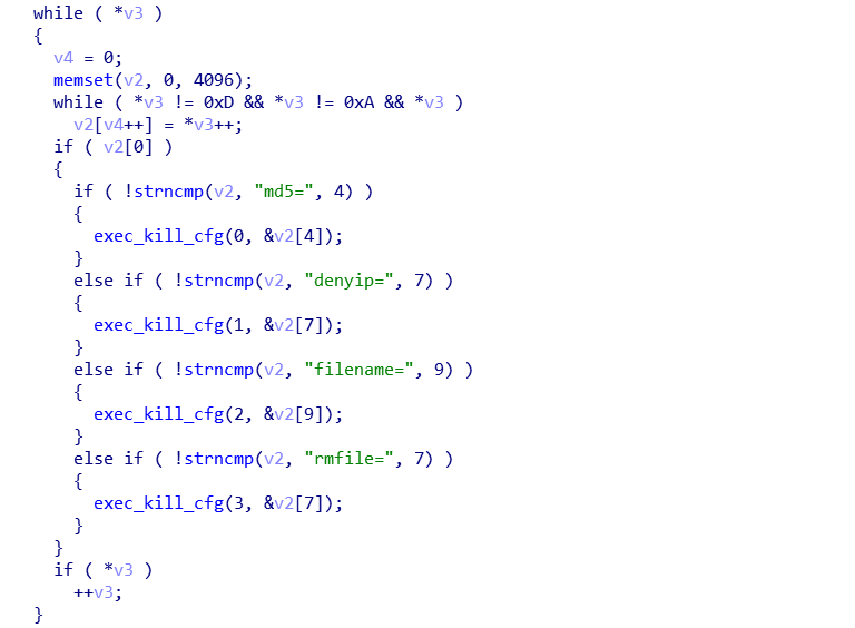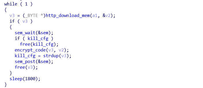 Daemon_get_kill_process线程在一个循环中持续从服务器端下载配置文件, 如果下载失败,就休眠1800秒,下载成功后,解密配置文件,然后将内容保存在kill_cfg变量中。