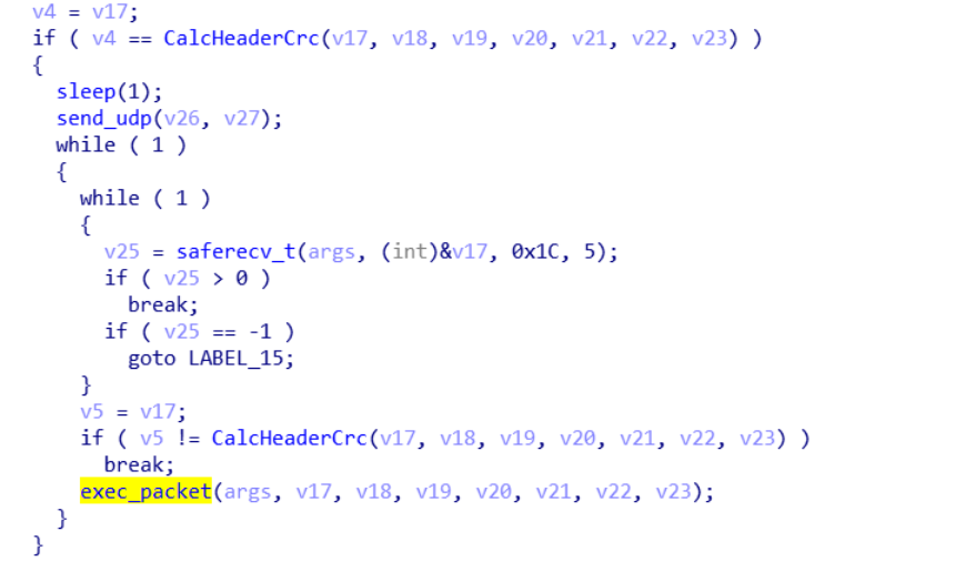 然后,根据服务器的返回数据,首先计算crc值进行校验,通过后对命令进行解码,进入exec_packet控制流程。