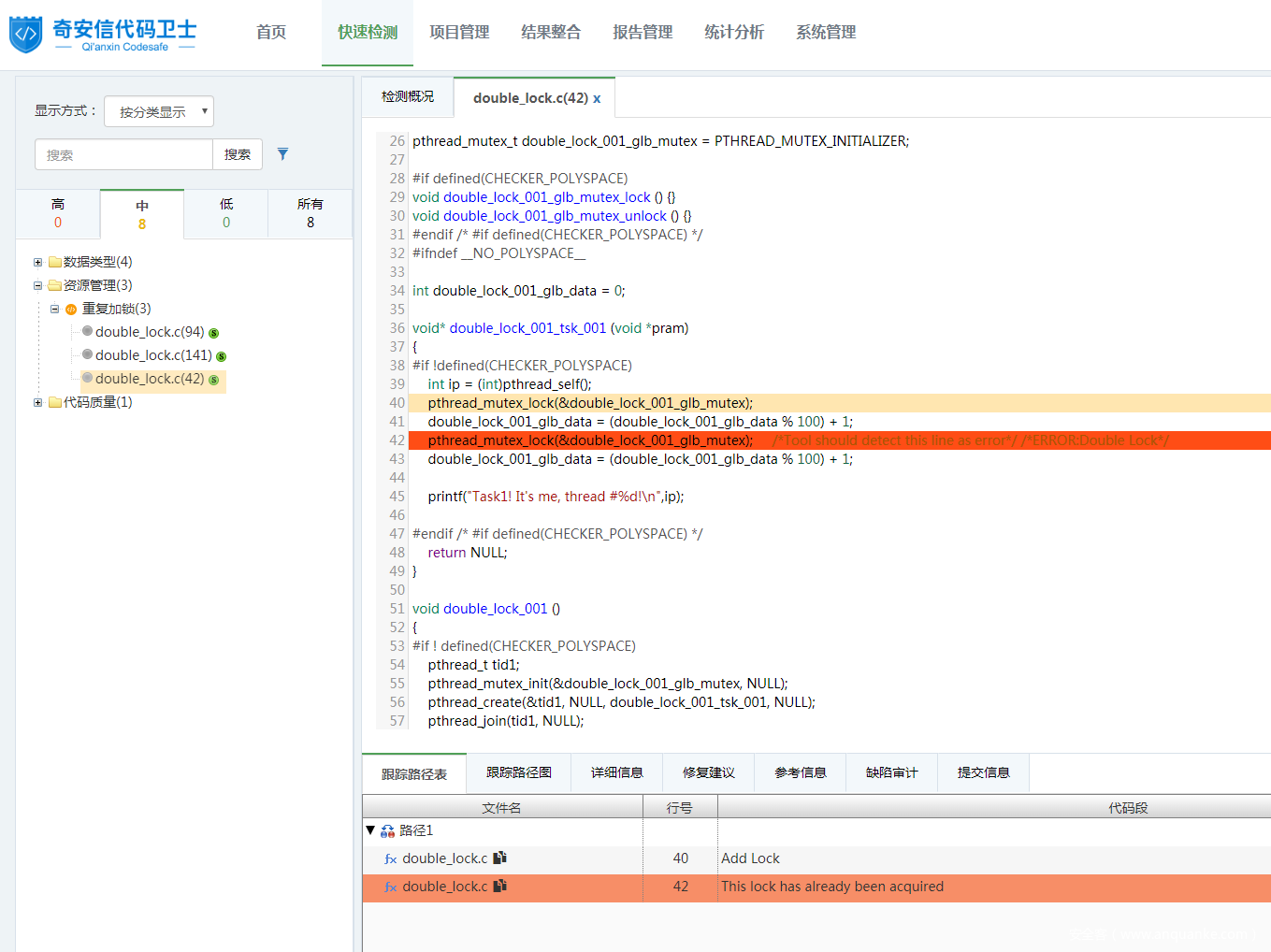 在上述示例代码中,第40行使用 pthread_mutex_lock() 函数对double_lock_001_glb_mutex 进行加锁操作,在没有进行解锁的情况下,第42行再次使用 pthread_mutex_lock() 函数对double_lock_001_glb_mutex 进行加锁操作,因此存在“重复加锁”问题。使用代码卫士对上述示例代码进行检测,可以检出“重复加锁”缺陷,显示等级为中。如图1所示: