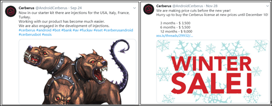 2019年Cerberusd的出现并通过其强大的功能,迅速被列入了顶级Android木马威胁的行列。更为有趣的是,Cerberus的作者专门开通了推特账号,在其推特下发布该恶意软件的促销广告,并尝试与其他感兴趣的人沟通,同时发布安全厂商披露Cerberusd的文章,以此进行打趣。