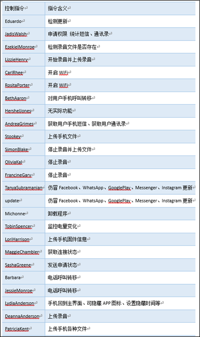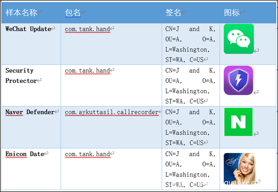 | 仿冒为聊天软件窃密 | 名为CallerSpy的聊天应用,本身并无聊天功能,目前应该处于测试阶段。启动时,CallerSpy启动与通过C&C服务器的连接Socket.IO监测即将到来的命令。然后,它利用Evernote Android-Job开始调度作业以窃取信息。 | 目前无受害用户 |