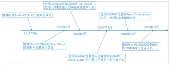 2019年8月,360烽火实验室在日常样本分析中发现一新型Android木马,根据其CC特点将其命名为SlideRAT,深入分析后发现该家族木马属于蔓灵花组织。此后,烽火实验室对该家族样本进行持续监控,2019年11初,发现SlideRAT攻击中国军工行业从事人员,11月中旬,该家族样本开始攻击中国驻巴基斯坦人员。短短半个月内,蔓灵花组织在移动平台至少进行了两次的攻击活动,且受害者均为中国人。