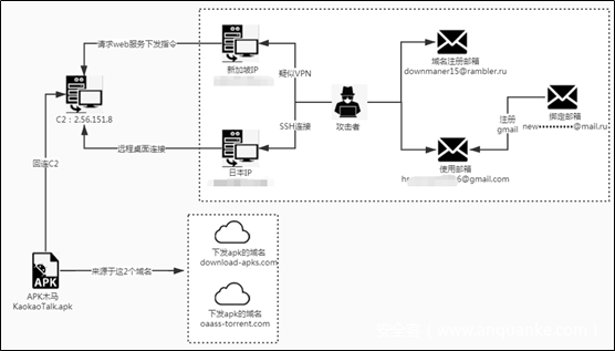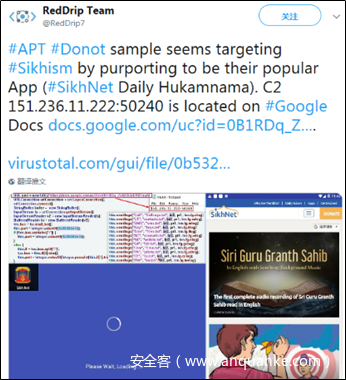 该APT组织主要针对政府机构等领域进行攻击,以窃取敏感信息为主要目的。该APT组织除了以携带Office漏洞或者恶意宏的鱼叉邮件进行恶意代码的传播之外,还格外擅长利用安卓APK进行恶意代码传播。