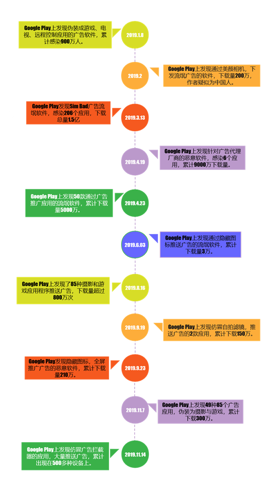 互联网盛行的今天,广告的收益非常大,这也就促使了很多团伙与个人通过各种手段推送广告获利。国际上对于流氓广告软件,其打击力度非常大,各大安全厂商及Google Play对于APP的审核也相当严格,然而面对海量的APP软件,总会有漏网之鱼。下面我们列举2019年Google Play上发现的影响较大的推送广告的流氓软件事件。