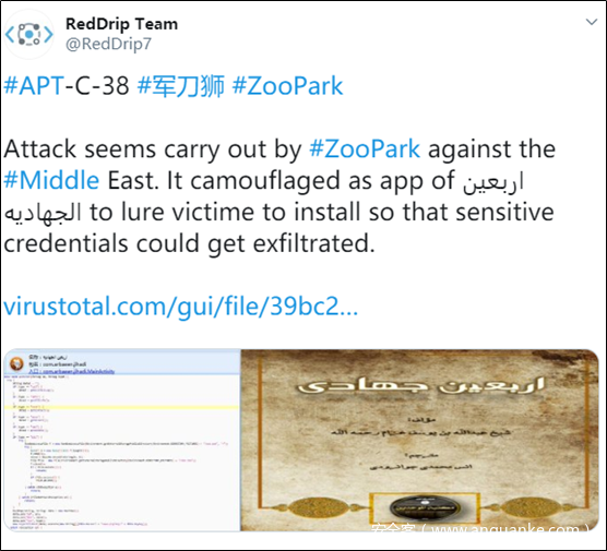 军刀狮组织在2018年5月首次被Kaspersky披露曝光,该组织为一个未归属的专注于中东目标的间谍活动组织,并命名ZooPark,涉及的攻击武器共包含四个迭代版本的Android端RAT,载荷投递方式包括水坑和Telegram频道。
