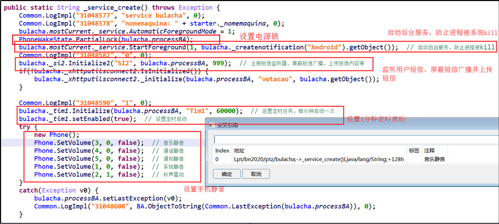 程序通过后台服务、电源锁等保证进程不被系统杀掉;通过对手机静音、屏蔽短信广播等方式防止被用户察觉;通过设置定时任务发送心跳包监控程序运行状态,达到持久化利用用户手机的目的。