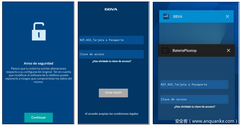 以BBVA应用为例进行测试,恶意程序能够成功覆盖原APP界面,效果如下所示: