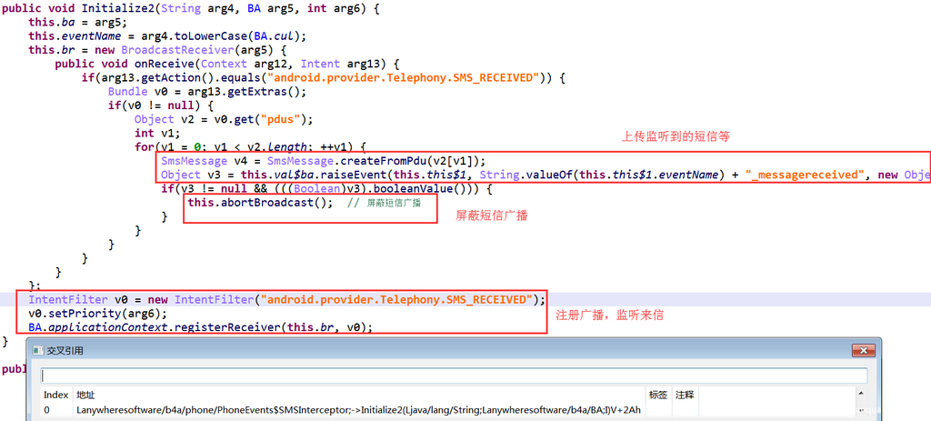 程序注册监听器,监听手机短信,当来短信后屏蔽短信广播,使用户接收不到短信提醒,同时上传短信内容到服务器。