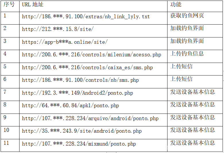 从这类样本的行为特征来看,主要针对桑坦德、玻利维亚、法希尔、西班牙等13家银行客户端实施网络钓鱼攻击,绕过银行双因子验证。通过网络钓鱼手段窃取用户银行相关的账号和密码,再上传用户手机短信验证码,最终目的是盗取用户的资金。是一种具有针对性钓鱼攻击行为,后续暗影实验室会持续关注此类样本的新进展