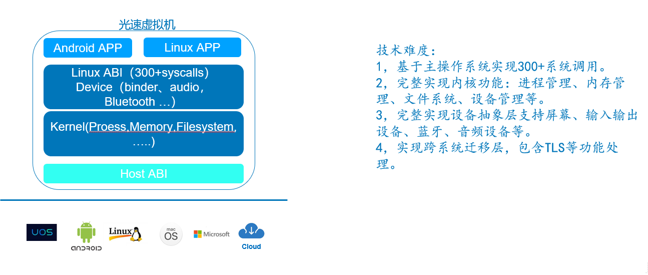 光速虚拟机具备很好的迁移性,不依赖于虚拟化技术、在主流系统平台包含国产操作系统UOS、Android、Linux、macOS、云上系统等运行Android和Linux应用程序。并且可以和Intel CPU的SGX或者arm CPU的trustzone技术结合来完成可信计算。