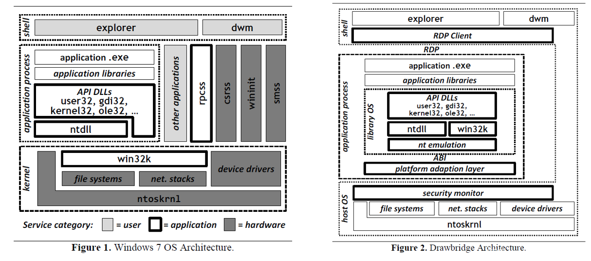 微软基于这样一个背景来做Drawbridge:VM的虚拟化技术效率不高,而传统的OS虚拟化技术,如Linux Container技术,安全性又不足,所以Drawbridge选择了一条两者兼顾的道路,把Kernel的内存状态放到了Windows Container中,用户间的隔离更彻底,而各个Container之间依然共享一部分资源,所以相较VM虚拟化效率要高。