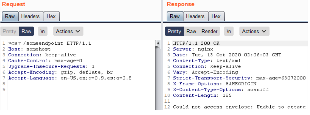 在响应里面你可以看到一个Content-Type的HTTP header头的值是text/xml,所以响应应该是一个有效的xml文档,但是这里我只得到了一个“Could not access envelope: Unable to create…”的错误。