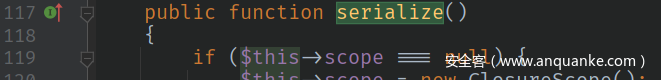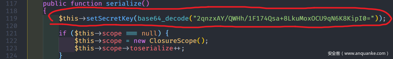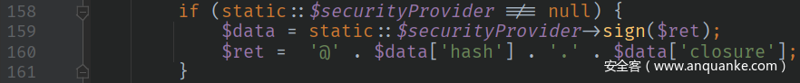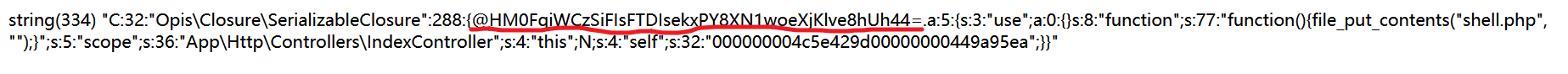 我们在本地生成payload的时候,也要手动生成一个static::$securityProvider,并且secret和远程受害者要是一样的才行。方法为,在本地的class SerializableClosure的源码SerializableClosure.php文件中加入这么一行(字符串为受害机.env文件中的密钥):