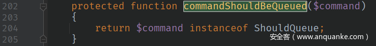 $command可控,$this->queueResolver可控,$this->commandShouldBeQueued要求$command为ShouldQueue的实例