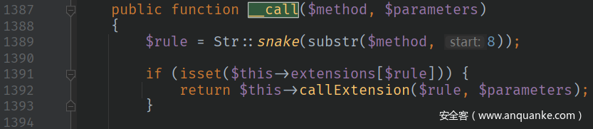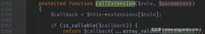 $parameters可控,$method为固定字符串dispatch,取substr($method, 8)后,为空字符串,故$rule为''。$this->extensions可控,跟踪$this->callExtension()方法