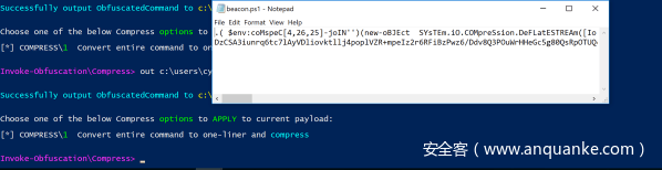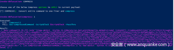 这款工具可以处理我们提供的脚本代码数据,然后询问我们要如何继续处理这段数据。在本文案例中,我选择的是COMPRESS以及子选项1。其他选项应该也可以试一下,但对于这个场景,我发现该方法的确行之有效(截至本文撰写时)。Invoke-Obfuscation可以担当大任,打印出一段比较混乱的PowerShell命令,足以绕过Windows Defender。