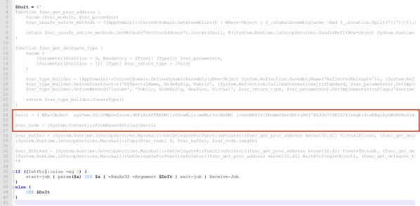 根据前文的分析,显然我们需要替换[Byte[]]$var_code = [System.Convert]::FromBase64String这部分内容,将其替换为Invoke-Obfuscation新创建的载荷。为了完成这个任务,我定义了一个新的变量$evil,用来保存Invoke-Obfuscation的输出结果。