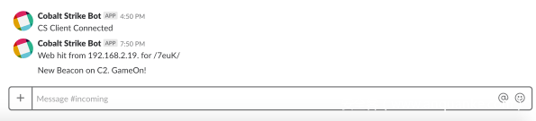 将编辑后的脚本保存到PowerShell文件中然后加以执行。生成的结果可以作为Cobalt Strike中的beacon,如果我们使用的是@sec_groundzero开发的Aggressor Script,这就是其中的Slack通知。